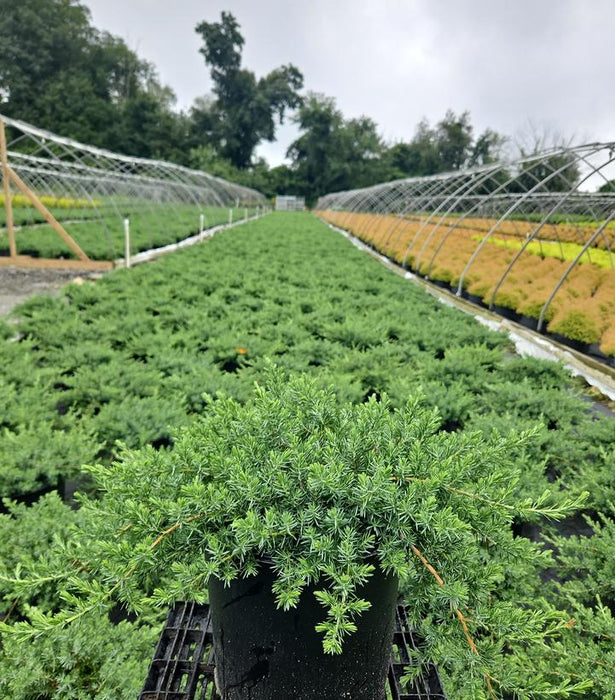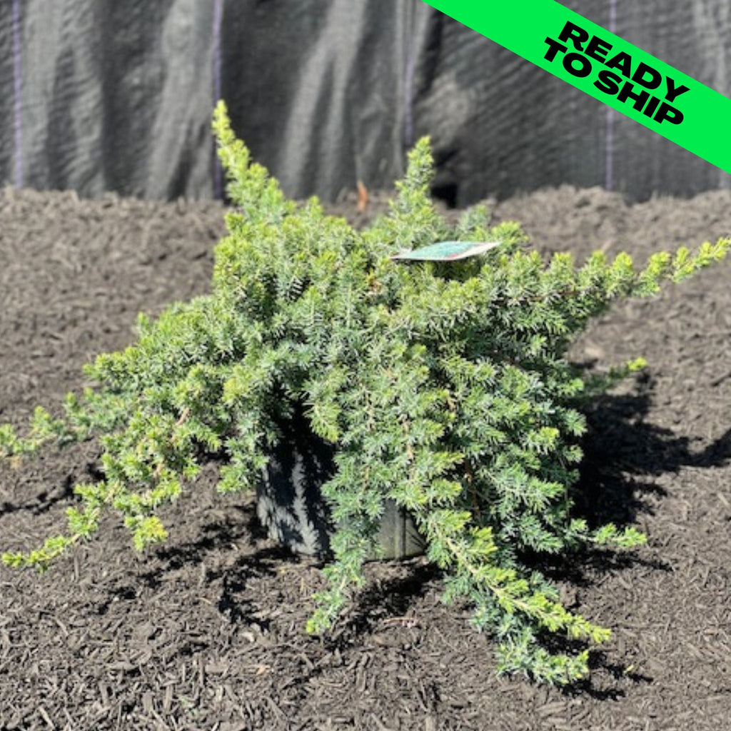 The Blue Pacific Juniper is a resilient evergreen ground cover with a dense carpet of vibrant green foliage. With a low height of around 1 foot, it quickly spreads to reach a width of 5-6 feet, creating a lush appearance.