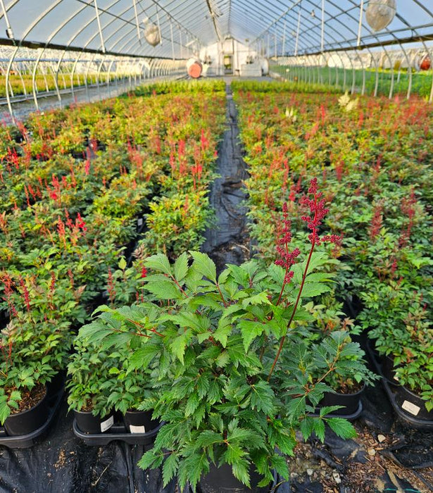 Introducing the Fanal Astilbe, a stunning perennial that adds a vibrant burst of color and texture to any garden or landscape. With its striking crimson-red plumes and deeply-cut, fern-like foliage, the Fanal Astilbe stands out as a captivating focal point in both sun-dappled and shaded areas.
